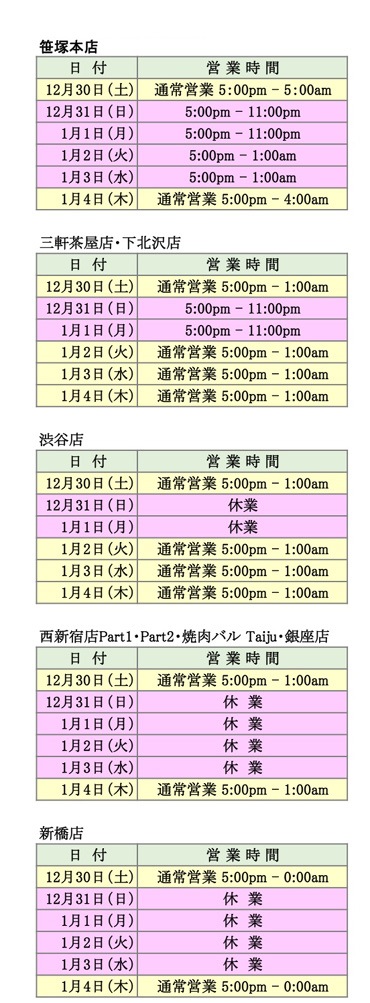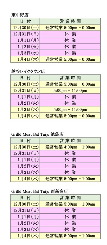 2017-2018 年末年始営業のご案内 2017年12月24日更新: 2018年8月3日Author: cmsadminカテゴリー: 太樹苑からのお知らせ 焼肉DINING太樹苑各店とGrilld Meat Bal Taijuは年末年始に限り、以下の通りに営業時間を変更させていただきます。 お客様にはご不便・ご迷惑をお掛けいたしますが、よろしくお願いいたします。 関連記事 焼肉DINING 太樹苑 笹塚本店 営業時間変更のお知らせ お客さま 各位 いつも、当店をご利用いただき誠にありがとうございます。 焼肉DINING 太樹苑 笹塚本店におきましては、6月より営業終了時間を変更いたします。 新しい営業時間は、5:00pm~2:00am(ラストオーダ […] 2018年5月30日更新: 2018年7月26日Author: cmsadminカテゴリー: 太樹苑からのお知らせ 焼肉DINING 太樹苑 忘年会・新年会のご案内 2017年-2018年 お得な冬の忘年会・新年会プランのご案内です。 太樹苑ならではのサービスと上質な味が魅力。幹事さん必見の太樹苑の忘年会・新年会プランをお楽しみください! お問合せ、ご予約は各店舗へ直接電話にてお願い […] 2017年11月25日更新: 2017年11月26日Author: cmsadminカテゴリー: 太樹苑からのお知らせ 9/19 OPEN! 西新宿 焼肉バル Taiju 焼肉DINING 太樹苑が新しいジャンル『焼肉バル』を西新宿にOPEN します。 おすすめはBBQ ステーキ。 牛の塊肉をベリーレアでご提供します。 テーブルのロースターでご自身のお好みの焼き加減に仕上げてお召し上がりい […] 2017年9月8日更新: 2017年9月21日Author: cmsadminカテゴリー: 太樹苑からのお知らせ